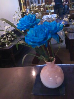 空いててほっとして、席に着いたら綺麗な蒼いお花を見つける。